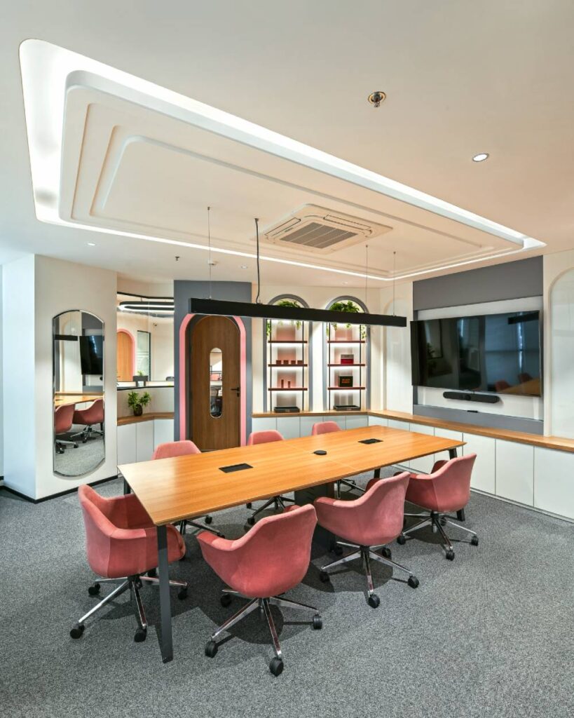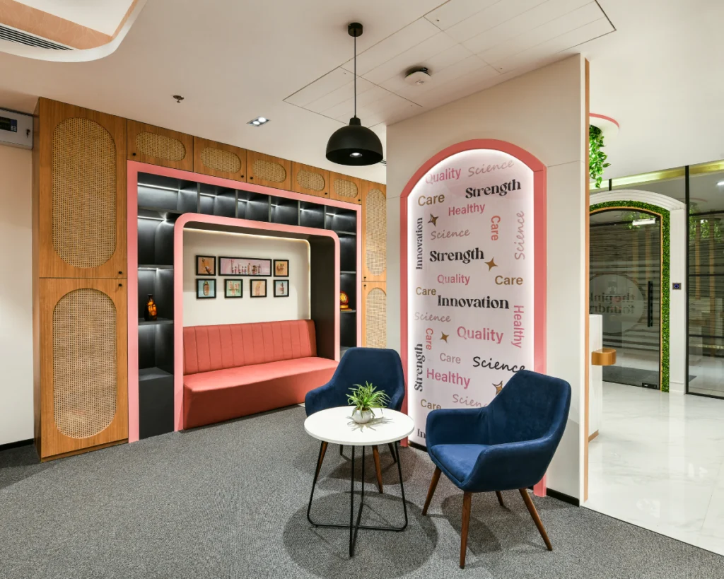 • Strategic Colour: A sophisticated palette of muted pinks, greys, and natural wood creates an energetic and engaging atmosphere.